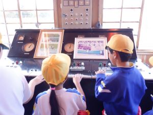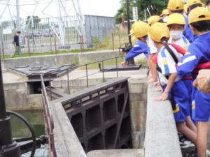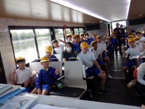 途中、中島閘門(こうもん)で下船し、普段見られない操作室を見学。そして、いよいよ「水のエレベーター」体験です!約2.5メートルの高低差を船ごと昇り降りする珍しい体験に、船の水位がどんどん下がっていく様子を目の当たりにし、みんな大興奮!歓声が上がりました。船内では、ガイドさんの手書きの絵を使った閘門の仕組みの説明を聞いたり、富山県にまつわるクイズで盛り上がったり。さらに、カルガモやアオサギ、時にはタヌキなどの生き物にも出会え、楽しいひとときとなりました。