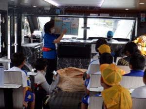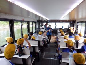 秋晴れのもと、10月3日(金)に3・4年生は富岩運河水上ラインに乗って、楽しい船旅に出かけました!富岩運河環水公園から岩瀬までの1時間余りの船旅は、冷房が効いた快適な船内でゆったりと過ごせました。