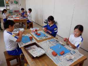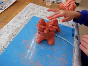 10月21日(火)5・6限に教材・教具を取り扱っている川渕商店の小栗さんをお招きして、図画工作科「シーサー(守り神)作り」の出前授業を行いました。製作するポイントを分かりやすく、具体的に伝えていただきました。どの子供も集中して取り組み、15体の個性豊かなシーサーが出来上がりました。