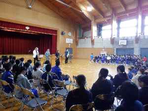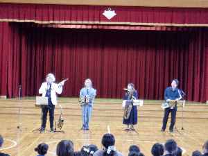 10月28日(火)3・4限に、保小中合同音楽会が本校で行われました。朝日町の保育園の年長児や、さみさと小学校の6年生、朝日中学校の3年生が一堂に会して、「カズトレインサックスカルテット」の皆さんの公演を鑑賞しました。子供たちは、素敵な演奏を聴き、自然と手拍子をしたり体を動かしたりして音楽の楽しさを味わっていました。