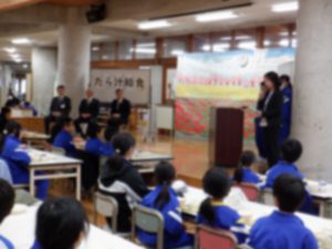11月21日(金)に、たら汁給食を行いました。来賓の皆様をお迎えし、ランチルームで一緒においしいタラ汁をいただきました。何杯もおかわりしたり、「温かくて美味しい」と顔を見合わせて話したりする姿が見られました。朝日町の郷土料理を味わう貴重な時間となりました。 朝日町沿岸漁業連絡協議会の皆様、朝日町漁業協同組合女性部の皆様、ありがとうございました。