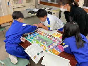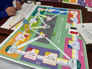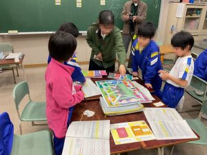 11月21日(金)、2年生は、生活科の学習と関連して、朝日町おでかけボードゲーム体験会を実施しました。講師に、商工観光課 地域おこし協力隊の松本さんをお迎えし、低学年向けのボードゲームで遊びました。ノッカル、まちバス、タクシーの地域交通を使いながら、朝日町の各施設を回ってゴールを目指しました。子供たちは「ノッカルを使ってみたくなりました」「実際にその場所に行ってみたくなりました」とゲームをきっかけに関心を高めていました。今後の「まちたんけん」や「まちのしせつ」の学習に生かしていきたいです。
