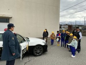 また、パトカーを試乗し、実際に無線機を使って話したり、サイレンを鳴らすタイミングなど教えてもらったりしました。 「みんなの安全を守るために、24時間体制で頑張っている」というお話を聞き、私たちの生活が守られていることに、子供たちはとても感動していました。